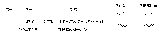 77779193永利集团数控技术专业群优质新形态教材开发项目招标项目的潜在投标人应在河南省公共资源交易中心网站(https://hnsggzyjy.henan.gov.cn/)获取招标文件,并于2025年12月17日09时00分(北京时间)前递交响应文件。